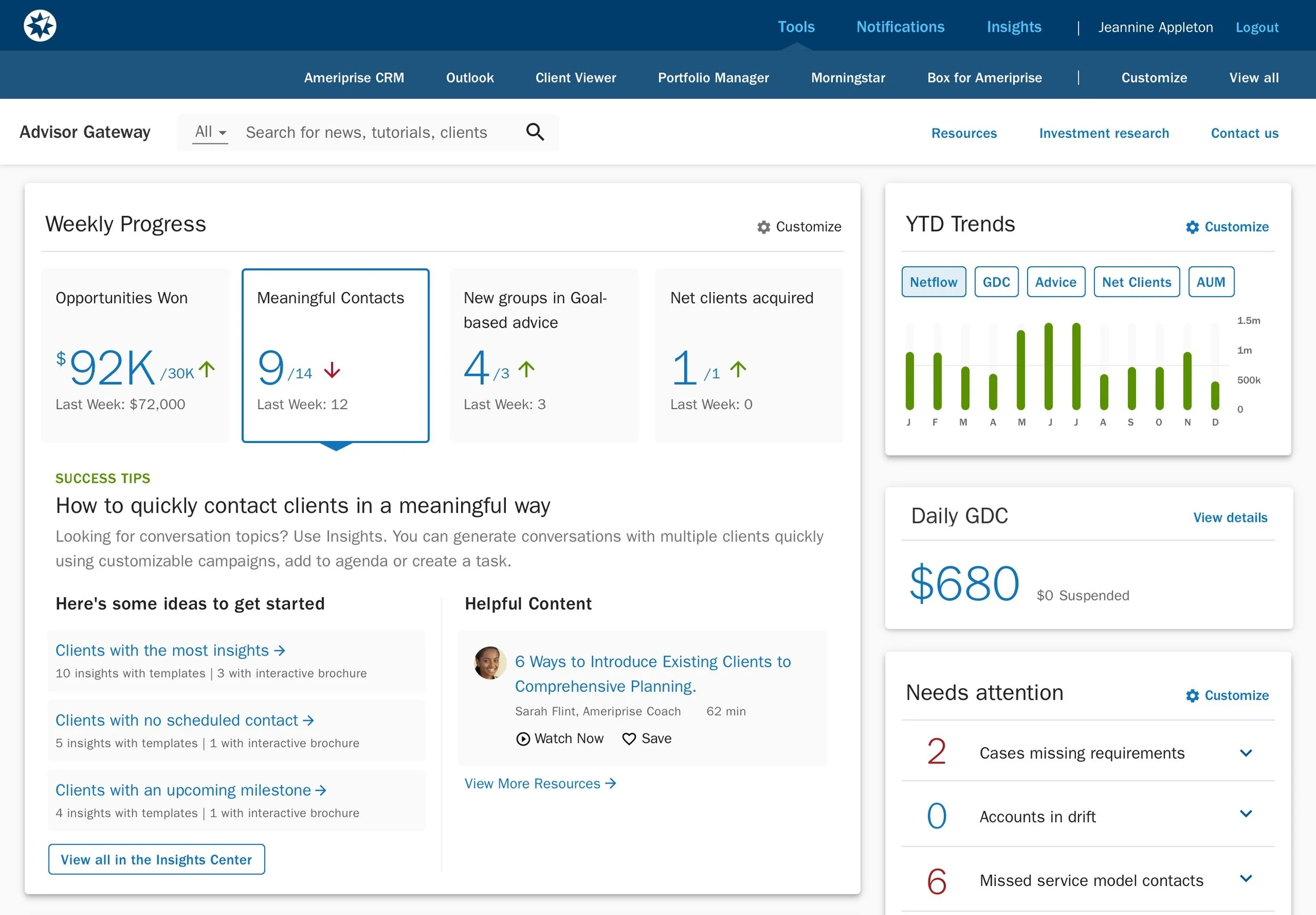 One of the results of the our end-to-end journey mapping was identifying the need for three integrated digital tools to empower advisors: Service Model Generator, Advisor Gateway, and Insights Center with an Automated Campaign Manager. We iteratively storyboarded and prototyped these three tools to provide Ameriprise with a vision to anchor their roadmap.